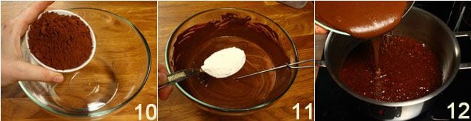 Coloque em uma tigela o cacau amargo peneirado 10, adicione cerca de 300 ml de água fria, misture e adicione a farinha peneirada 11; misture até obter um creme denso e sem grumos. Adicione a mistura de cacau e farinha à calda 12, deixe cozinhar até que tudo esteja espesso, depois desligue o fogo.