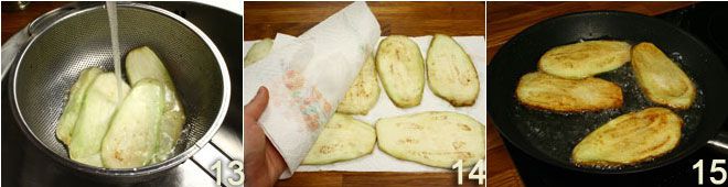 Após o tempo necessário, enxágue as berinjelas 13, seque-as 14 e frite-as em bastante óleo 15, até dourar, depois coloque-as em papel-toalha para que o excesso de óleo seja absorvido.