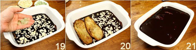 Pegue uma assadeira e despeje um pouco de creme de chocolate no fundo 16; comece a dispor as fatias de berinjela uma ao lado da outra até formar a primeira camada 17 que você cobrirá com creme 18.