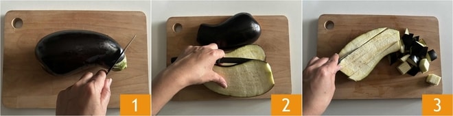 Para preparar as berinjelas na fritadeira a ar, comece lavando as berinjelas. Depois, coloque-as em uma tábua e retire as extremidades 1. Corte as berinjelas primeiro em fatias 2, depois em palitos, finalmente comece a cortar em cubos mais ou menos regulares de cerca de 1 cm 3.