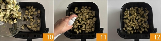 Então, coloque as berinjelas no cesto da fritadeira a ar, você pode usar papel manteiga, mas apenas se tiver o papel perfurado apropriado 10, caso contrário, pode não usá-lo. (usamos uma fritadeira com capacidade de 6,5 litros). Uma vez organizadas as berinjelas dentro do cesto, borrife óleo spray ou despeje óleo em fio 11 12.