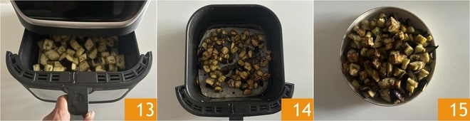 Cozinhe então as berinjelas a 200° por cerca de 15 minutos, tomando cuidado para verificá-las na metade do tempo 13 e, se necessário, mexê-las. Os tempos podem variar ligeiramente dependendo da fritadeira e do tamanho das berinjelas, avalie a douração e, uma vez douradas, estarão prontas 14. Transfira para uma tigela e sirva suas berinjelas na fritadeira a ar 15.