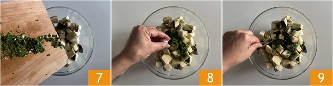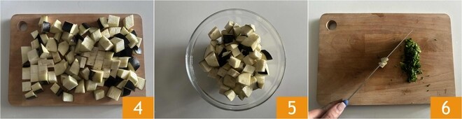 Quando você tiver obtido seus cubos 4, transfira-os para uma tigela 5. Pique finamente o manjericão, a salsa e o alho 6.