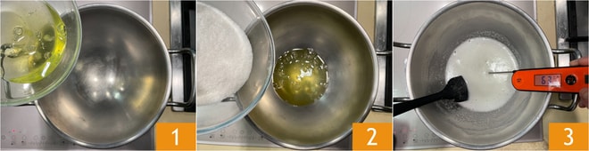 Para preparar o merengue suíço, a primeira coisa que você deve fazer é colocar uma tigela sobre uma panela com água. Despeje as claras 1 e o açúcar 2 na tigela e aqueça em fogo médio. Cozinhe em banho-maria, certificando-se de que a água não toque a tigela, mexendo continuamente com uma espátula 3 e controlando a temperatura com um termômetro de cozinha. Você deve atingir uma temperatura de 60-65°C.