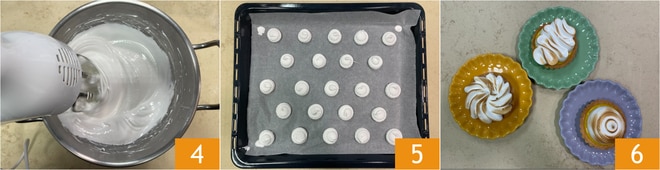 Neste ponto, retire a tigela do fogo e da panela com água e bata com a batedeira elétrica 4 até o merengue esfriar completamente. A mistura deve estar brilhante e ter a consistência de espuma de barbear e estará pronta quando, ao levantar as batedeiras, você notar a formação de um tufo. Você pode usar o merengue de duas maneiras. Transfira-o para um saco de confeitar com um bico em forma de estrela e faça 30 tufos em uma assadeira forrada com papel manteiga 5. Asse em forno estático a 90°C por cerca de 2 horas. Estarão prontos quando estiverem secos, muito leves e ocos por dentro. Ou você pode usar o merengue suíço para decorar seus doces e flambá-lo com um maçarico 6.