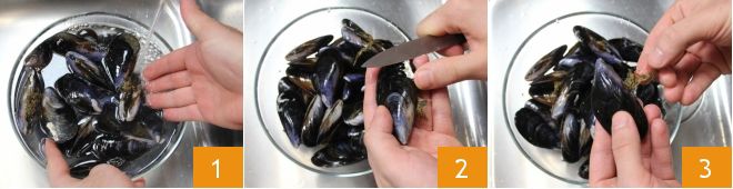 Para preparar os mexilhões em molho de açafrão, comece pela limpeza dos mexilhões: coloque os mexilhões em uma tigela e lave-os em água corrente fria 1. Com a ajuda de uma faca, remova as impurezas da concha do mexilhão 2, depois retire a barba (ou biso) puxando com as mãos 3, depois com uma escova rígida esfregue rapidamente e vigorosamente os mexilhões um a um sob água corrente e reserve-os.