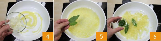 Em uma frigideira antiaderente, refogue, com um pouco de óleo, a cebola picada finamente 4, adicione duas folhas de louro 5 e a salsa picada, reservando um pouco para a guarnição final 6.