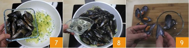Assim que a cebola murchar, adicione os mexilhões 7 e deixe-os abrir em fogo alto, flambando com o vinho branco 8. Assim que todos os mexilhões abrirem, retire-os da panela, elimine a parte da concha que não contém o molusco e reserve-os, mantendo-os aquecidos.