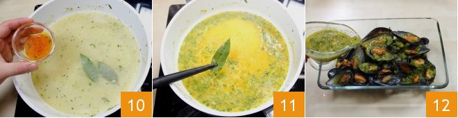 Agora, reduza o líquido de cozimento adicionando um sachê de açafrão previamente dissolvido em um pouco do líquido dos mexilhões 10, até obter um creme espesso, em seguida, elimine as folhas de louro 11. Coloque os mexilhões em um prato de servir e cubra-os com o creme, finalmente, decore com salsa picada finamente. Os mexilhões em molho de açafrão estão prontos, sirva-os imediatamente.