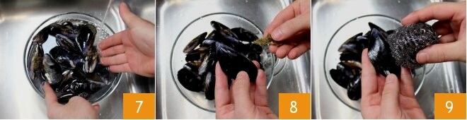 Agora dedique-se à limpeza dos mexilhões (para mais detalhes, consulte nossa escola de cozinha: Como limpar os mexilhões). Lave bem os moluscos sob bastante água corrente 7 e retire as barbichas que saem das conchas 8. Com a ajuda de uma faquinha, elimine as incrustações e cracas na casca e, para uma maior limpeza, passe uma esponja de aço na casca para eliminar as impurezas restantes 9.