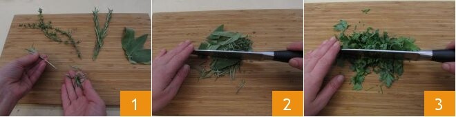 Para preparar os mexilhões em molho de vinho branco e creme de leite, comece pelas ervas aromáticas: lave-as bem e seque-as. Em seguida, destaque as folhas de tomilho e alecrim dos ramos 1 e pique-as finamente, junto com a sálvia 2. Pique finamente também a salsinha, reservando-a 3.