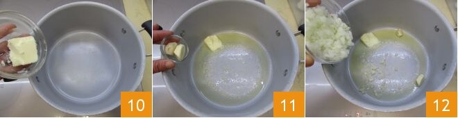 Agora pegue uma panela alta e com fundo antiaderente e derreta em fogo muito baixo 40 g de manteiga 10. Quando estiver derretida, adicione o alho 11 e a cebola 12.