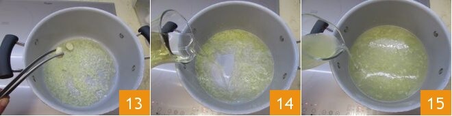 Quando o alho estiver dourado, retire-o 13. Regue com o vinho branco 14 e adicione o suco de limão 15.