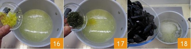 Aromatize com as cascas de limão 16. Adicione a mistura de sálvia, alecrim e tomilho 17, mexendo bem os ingredientes. Finalmente, junte os mexilhões 18.