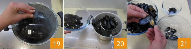 Cubra com a tampa 19 e deixe cozinhar assim em fogo baixo por 3-4 minutos. Quando os mexilhões se abrirem, com a ajuda de uma escumadeira, transfira-os para uma tigela 20 e abra alguns 21, eliminando as cascas.