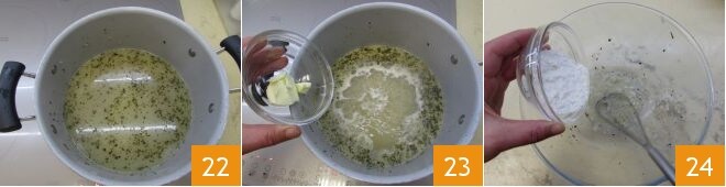 Reduza o líquido de cozimento 22 e acrescente os restantes 10 g de manteiga 23 que você deixará derreter. Transfira uma concha do líquido de cozimento para uma tigela grande na qual você colocará a farinha em chuva, continuando a bater com o fouet manualmente para criar uma mistura homogênea e sem grumos 24.