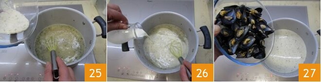 Transfira novamente para a panela enquanto continua a misturar os ingredientes para evitar a formação de grumos 25: deixe engrossar em fogo muito baixo por 2-3 minutos. Depois, adicione o creme de leite 26, sempre continuando a bater. Finalmente, coloque novamente os mexilhões na panela 27.