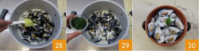 Misture bem ao líquido de cozimento 28 e deixe que se insiram aquecendo em fogo baixo por 3-4 minutos. Aromatize com a salsinha picada 29, incorporando-a bem aos outros ingredientes e apague o fogo. Por fim, ajuste o sal e a pimenta. Sirva agora os mexilhões em molho de vinho branco e creme de leite e saboreie-os ainda quentes 30!