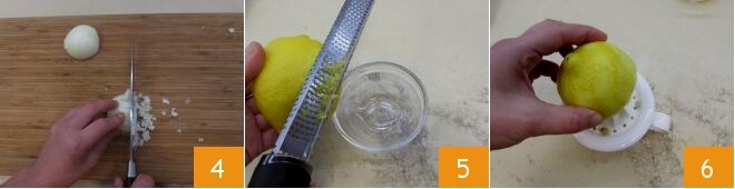 Agora descasque e pique finamente a cebola 4. Passe para o limão não tratado: rale a casca e coloque em uma tigelinha 5. Esprema e obtenha o suco 6: reserve o suco e as cascas.
