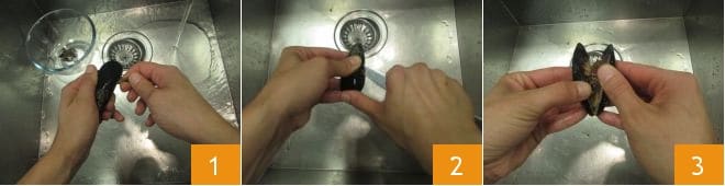 Para preparar os mexilhões fritos, a primeira coisa a fazer é cuidar da limpeza dos mexilhões. Uma vez limpo a concha com uma palha de aço e eliminada a barbinha interna 1, você deverá abri-los crus. Para fazer isso, basta segurar o mexilhão com a mão esquerda e deslizar a lâmina de uma faquinha entre as duas conchas empurrando para fora 2. Depois abra as duas valvas, deixando-as unidas 3.
