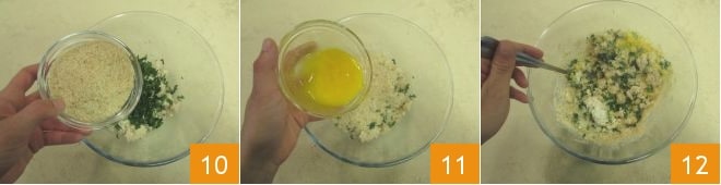 Adicione também cerca de 40 g de farinha de rosca 10 e os ovos 11. Misture tudo até obter uma mistura uniforme 12.