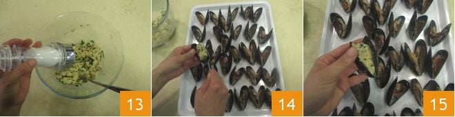 Ajuste o sal 13 e a pimenta. Neste ponto será necessário ajustar a mistura adicionando mais farinha de rosca de acordo com a quantidade de água liberada pelos mexilhões até obter uma consistência seca e compacta. Disponha os mexilhões em uma bandeja e preencha-os com cerca de 1 colher de chá da mistura recém-preparada 14 15, depois pressione a mistura e feche ligeiramente as valvas.