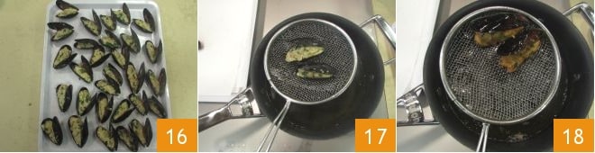 Assim que você tiver preenchido todos os mexilhões 16, aqueça o óleo até atingir a temperatura de 170°C e quando estiver quente, mergulhe poucos pedaços por vez usando uma escumadeira 17. Preste muita atenção porque nesta fase o óleo pode espirrar. Quando estiverem bem dourados, levará de 3 a 4 minutos, escorra-os 18.