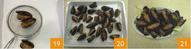 Transfira os mexilhões para uma folha de papel toalha 19 e continue fritando todos os outros 20. Sirva seus mexilhões fritos ainda quentes 21!