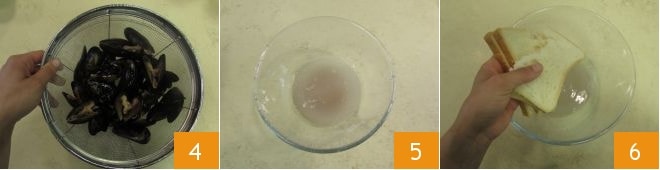 Coloque os mexilhões abertos dentro de uma peneira que você terá posicionado sobre uma tigela e continue abrindo os outros mexilhões 4. Agora cuide do recheio: mova a peneira com os mexilhões conservando a água liberada 5, depois adicione o pão esfarelando-o grosseiramente 6.