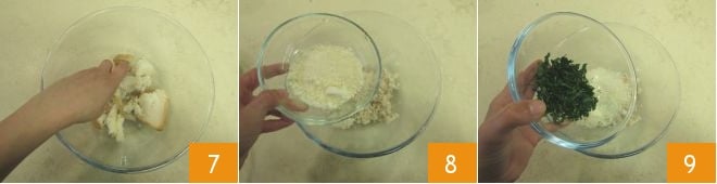 Amasse tudo com as mãos 7, depois adicione o Parmesão 8 e a salsinha picada finamente 9.