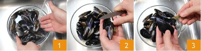 Para preparar as mezze maniche rigate com molho de capim-limão, comece limpando os frutos do mar. Primeiro, pegue os mexilhões, coloque-os em uma bacia grande e enxágue-os em água fria corrente 1. Com o dorso da lâmina de uma faca, remova todas as incrustações 2 e, com um movimento enérgico, retire a barba, ou biso, que sai das conchas 3.