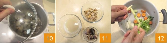 Coloque uma tampa 10 e cozinhe as amêijoas em fogo alto até que estejam completamente abertas. Também nesse caso, não levará mais de 5 minutos. Depois de esfriar um pouco, remova as cascas das amêijoas, cuidando para coletar e conservar o líquido produzido durante o cozimento 11. Continue com outra preparação longa prevista para esta receita: o caldo de legumes. Coloque cebola, aipo, cenoura e capim-limão em uma panela 12