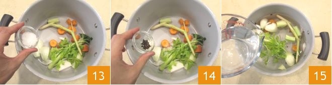 E adicione sal grosso 13 e pimenta em grãos 14, depois cubra com água 15 e deixe ferver por pelo menos meia hora.