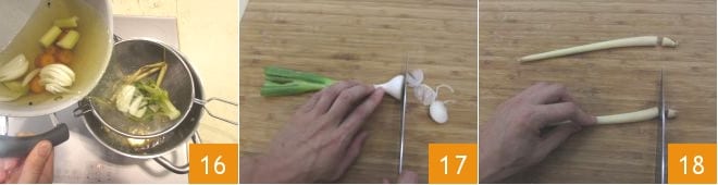 Ao término do cozimento, coe o caldo de legumes e capim-limão e reserve 16. Agora passe para a preparação do molho. Limpe a cebolinha e corte em rodelas finas 17, depois limpe o capim-limão 18