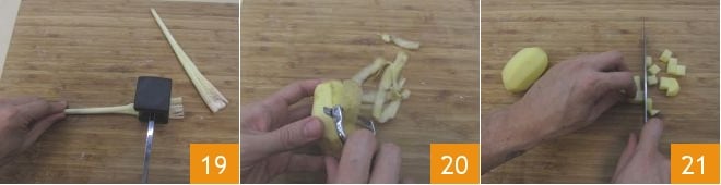 E amasse-o com um pilão para liberar o aroma 19. Descasque as batatas 20 e corte em cubinhos 21.