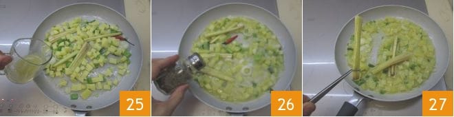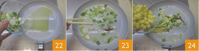 Coloque um fio de óleo na panela, adicione a cebolinha 22 e refogue em fogo baixo. Adicione também uma pimenta inteira, o capim-limão amassado 23 e os cubinhos de batata 24.