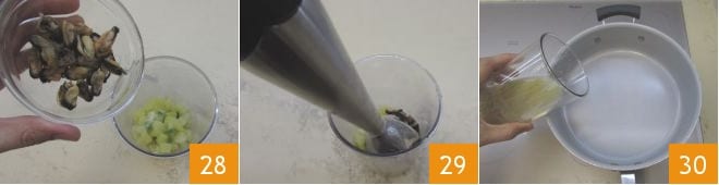 Transfira as batatas para o copo do liquidificador e adicione cerca de 30 g de mexilhões sem casca 28. Bata bem 29 para obter um molho liso e reserve. Agora passe para a parte final da receita, o cozimento do macarrão ao estilo risoto. Regue o fundo de uma panela com um pouco do caldo de legumes 30