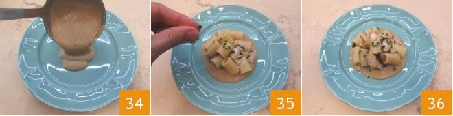 Proceda à montagem: distribua em cada prato o creme de capim-limão 34, coloque o macarrão por cima e polvilhe com cebolinha picada 35. Suas mezze maniche rigate com molho de capim-limão estão prontas para serem degustadas 36!