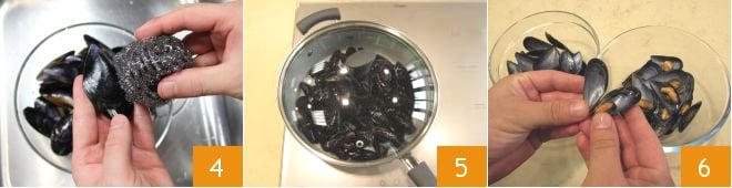 Com uma palha de aço, esfregue os mexilhões para eliminar qualquer impureza adicional 4. Escorra os mexilhões limpos, seque-os, transfira-os para uma panela onde você terá aquecido um fio de óleo e meio dente de alho inteiro e cubra com uma tampa 5. Deixe cozinhar em fogo alto por cerca de 5 minutos, até que todos os mexilhões estejam abertos. Deixe esfriar antes de retirar as cascas 6 e reserve o líquido produzido durante o cozimento.