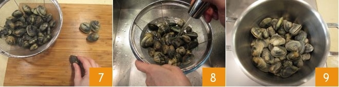 Passe para as amêijoas: primeiro, faça uma seleção das amêijoas, eliminando as abertas ou quebradas. Em seguida, bata em uma superfície (por exemplo, uma tábua de corte) cada amêijoa 7, para que percam um pouco da areia e das impurezas. Coloque-as em um escorredor posicionado sobre uma tigela (certifique-se de que não toque o fundo) e enxágue várias vezes em água corrente 8. Você pode deixá-las de molho por alguns minutos, depois trocar a água várias vezes, até que não haja mais resíduos de areia no fundo da tigela. Aqueça um fio de óleo em uma panela com meio dente de alho e adicione as amêijoas escorridas 9