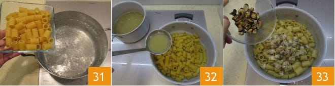 E adicione o macarrão 31. Cozinhe o macarrão, adicionando caldo sempre que o macarrão absorver completamente o anterior 32. Adicione, quase no final do cozimento, as amêijoas e os mexilhões sem casca 33.