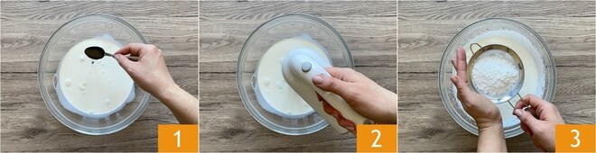 Para preparar o mil-folhas de morangos, a primeira coisa a fazer é colocar o creme de leite em uma tigela e adicionar o extrato de baunilha 1. Comece a bater com a batedeira 2 e, quando começar a engrossar, adicione o açúcar de confeiteiro peneirando-o 3.