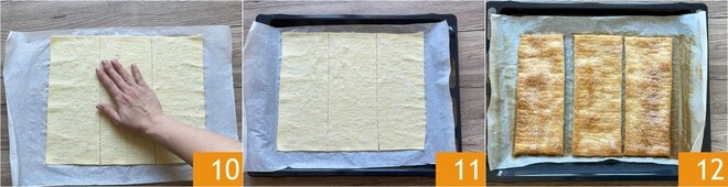 Aperte levemente para que o açúcar penetre 10 e transfira a massa para uma assadeira 11. Asse em forno estático pré-aquecido a 200°C por cerca de 15-30 minutos, até que esteja bem dourada. Retire do forno 12 e deixe esfriar completamente.