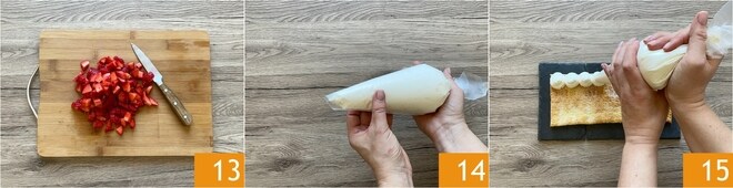 Neste ponto, lave bem os morangos e reserve 4 inteiros para a decoração final. Remova o cabinho dos outros e corte-os em cubos 13. Assim que o creme estiver bem firme, transfira-o para um saco de confeitar. Você pode usar um bico liso ou simplesmente cortar a ponta do saco 14. Pegue uma das bases de massa e coloque-a em um prato de servir. Faça pequenos montes de creme por toda a superfície 15.