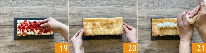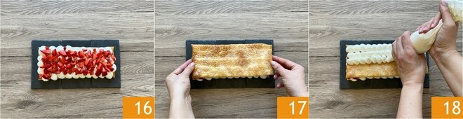 Adicione os morangos restantes 19 e finalize cobrindo com a última camada de massa 20. Faça pequenos montes de creme no centro da massa com o creme restante 21.