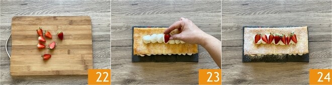 Retome os morangos que você reservou e corte-os ao meio 22. Use-os para decorar o mil-folhas, colocando-os sobre os montes de creme 23. Polvilhe o mil-folhas de morangos com açúcar de confeiteiro 24 e coloque na geladeira até o momento de servir.