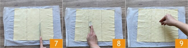 Corte a massa no lado mais longo, de forma a obter 3 retângulos do mesmo tamanho 7. Fure a massa com os dentes de um garfo 8 e polvilhe com bastante açúcar 9.