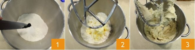 Para preparar a mil-folhas de figos, coloque em uma batedeira com pá, a farinha, o sal, o açúcar, as sementes da fava de baunilha 1, a manteiga amolecida 2, ligue a máquina e quando a mistura estiver bem homogênea 3