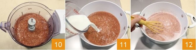 bata-os até obter um molho sem grumos 10, transfira-o para uma panela, adicione o leite 11 e aqueça o molho, mexendo com um batedor 12.
