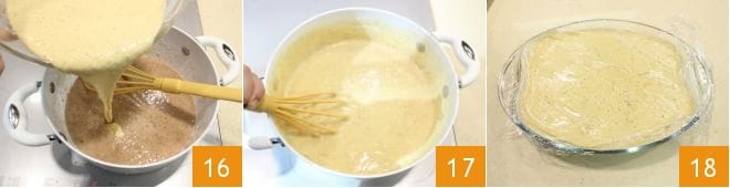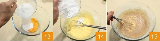 À parte, em outra tigela, bata as gemas com o açúcar 13, adicione o amido de milho 14, e a essa mistura, adicione metade do molho de figos aos ovos e misture com um batedor para integrar os ingredientes 15.